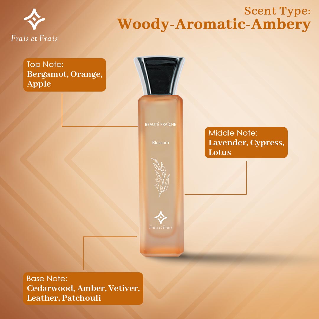 Blossom Perfume opens with a vibrant burst of bergamot, orange, and apple, delivering an energetic introduction. As the fragrance settles, calming lavender and earthy cypress blend with the exotic allure of lotus. The base notes of cedarwood and amber provide a lasting warmth, while vetiver and patchouli add depth. This unisex fragrance is perfect for those who appreciate freshness balanced by a sensual, woody undertone.