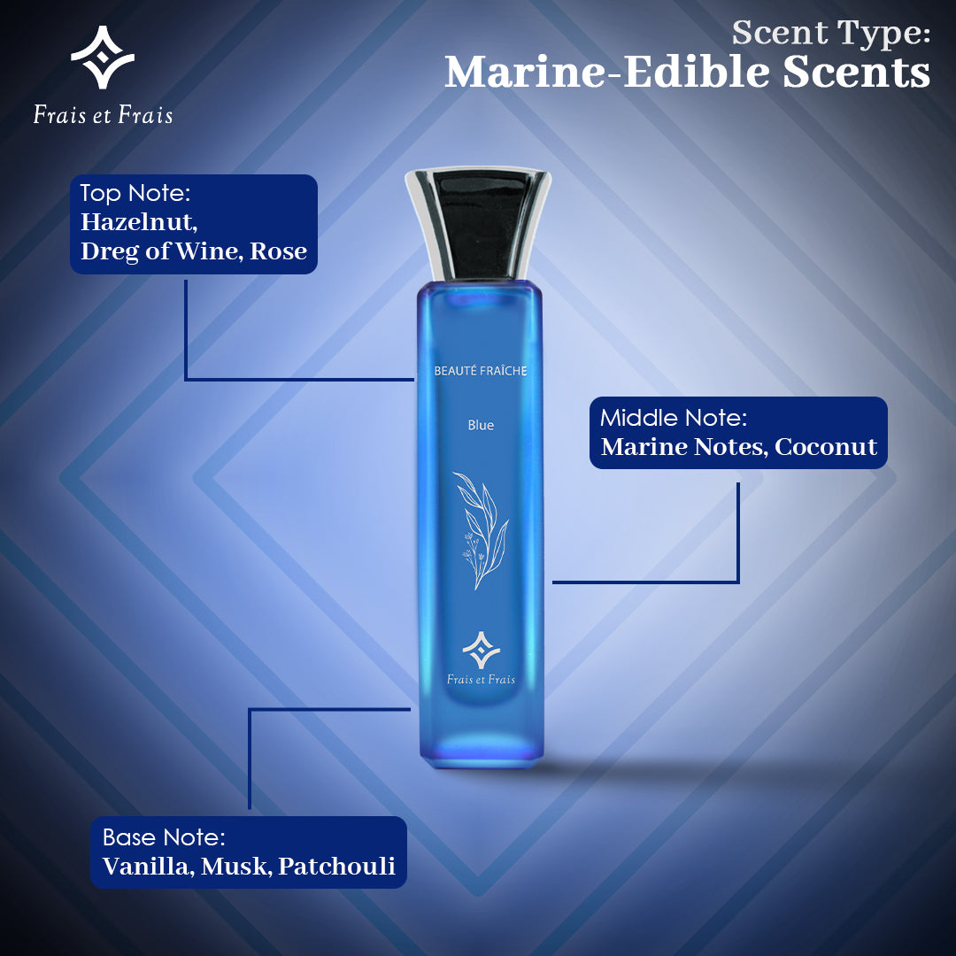 Blue Perfume is an adventurous blend of marine and edible accords, opening with hazelnut and a surprising note of wine dregs, softened by rose. The heart introduces refreshing marine notes balanced by creamy coconut, while the gourmand base of vanilla and musk is grounded by patchouli. This unisex fragrance is perfect for ocean lovers, offering a fresh, comforting scent that’s as unique as it is irresistible.