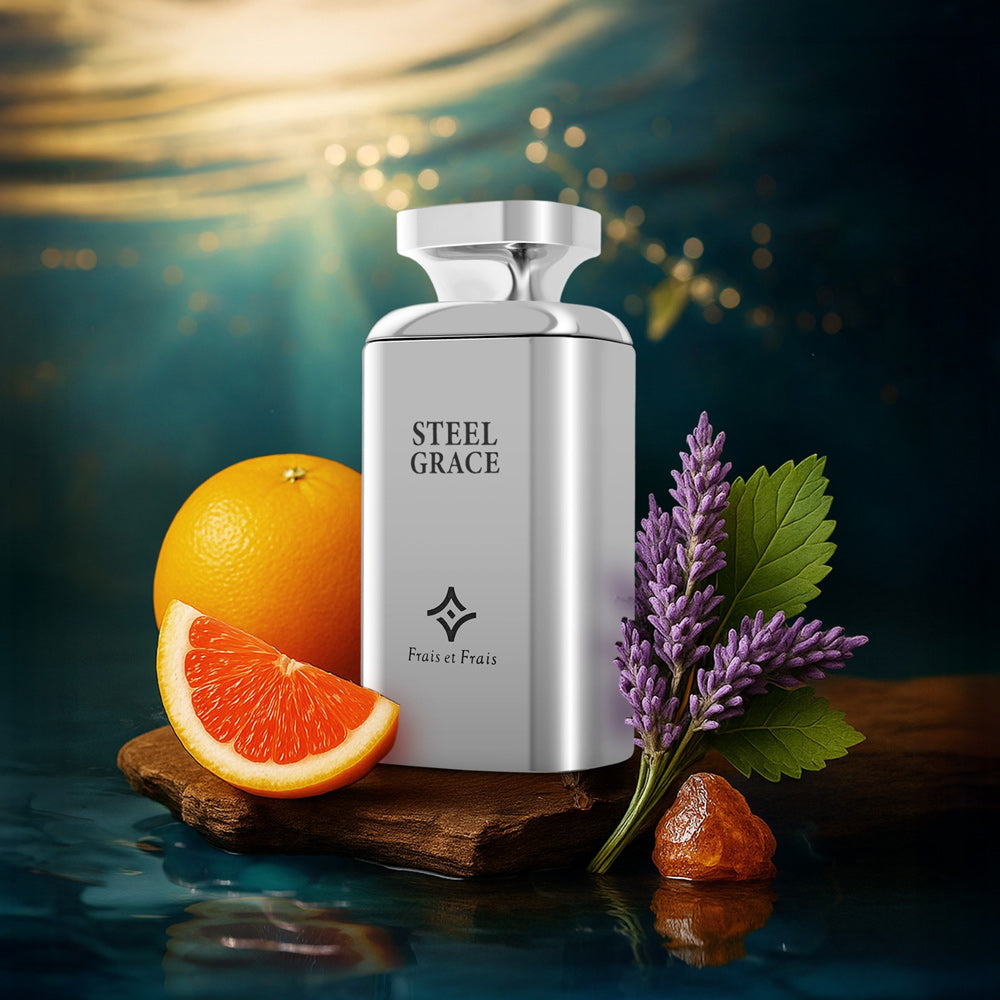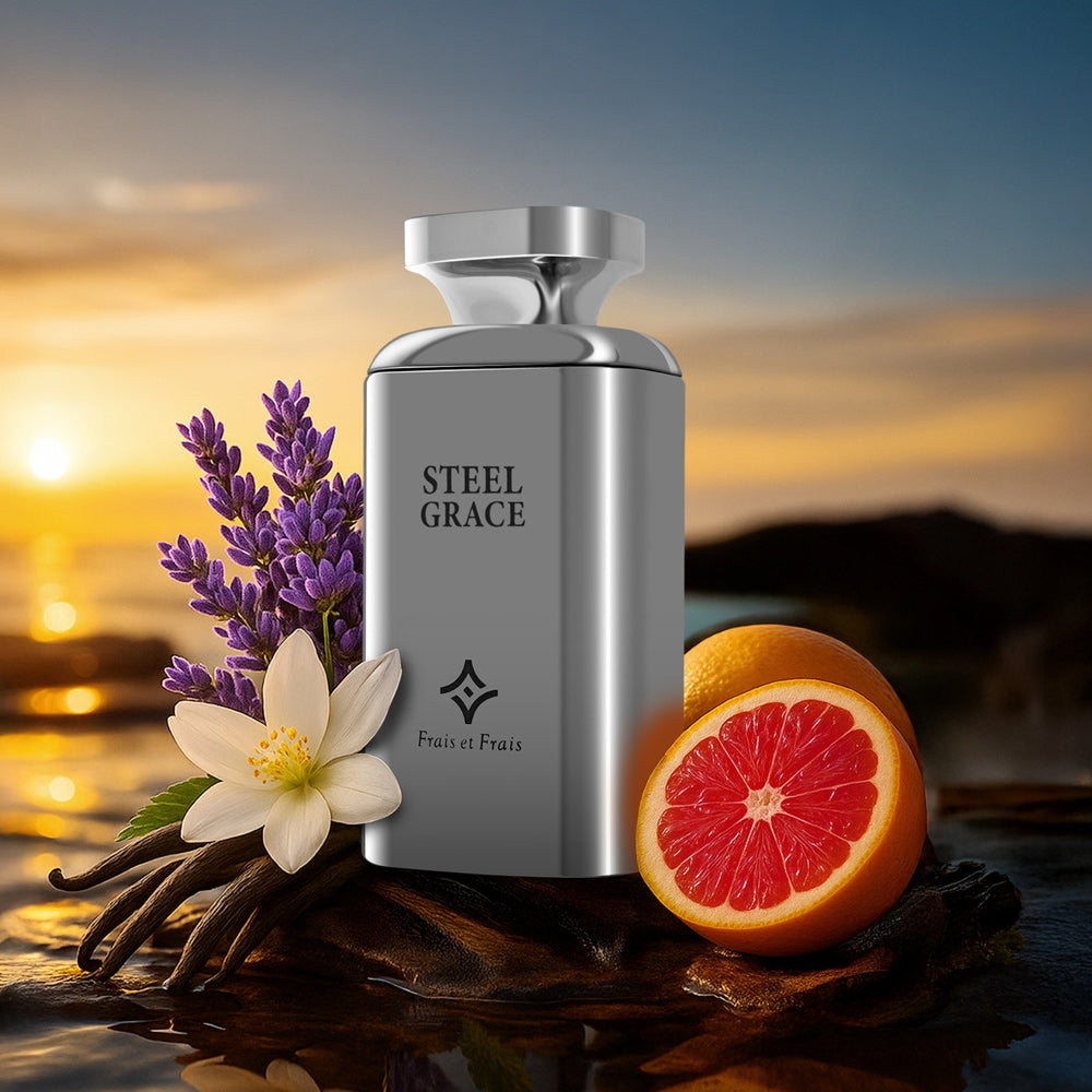 Steel Grace is a fragrance of unwavering strength and effortless sophistication, designed for men who navigate life with bold confidence. It opens with a crisp and invigorating fusion of grapefruit and marine accords, evoking the rush of an open sea and the promise of adventure. The heart introduces earthy patchouli, bay leaf, and oakmoss, grounding the scent in a masculine elegance that commands respect. As the fragrance settles, amber, vanilla, and musk woody notes weave together, creating a warm, refined finish that lingers. A scent for the man who balances power with poise, forging his own path with distinction.